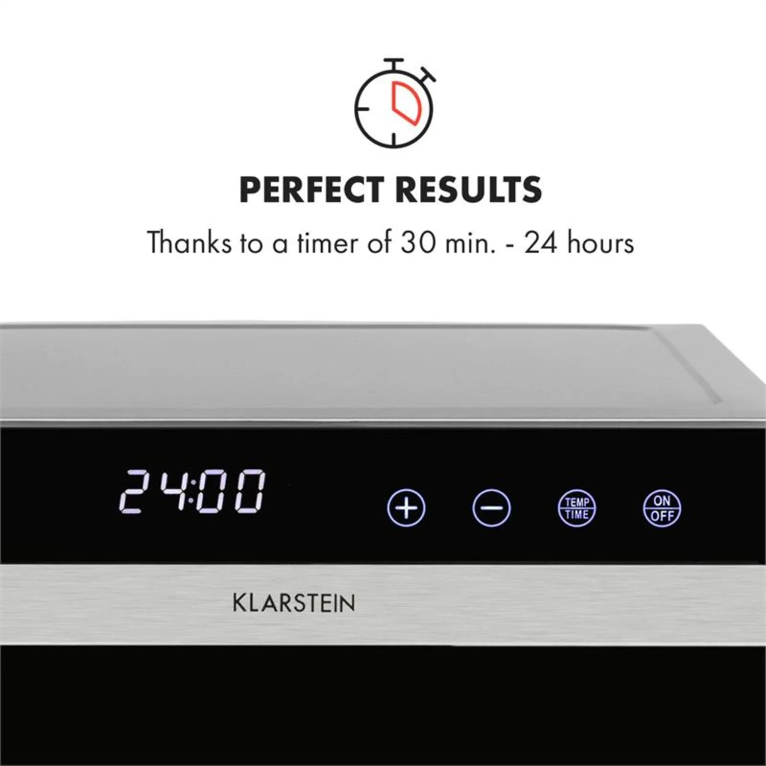 Der leistungsstarke Klarstein Flavour Dry Dörrautomat trocknet Obst, Gemüse, Fleisch und andere Lebensmittel im Rekordtempo und stellt damit leckere, haltbare Snacks und Zutaten her. Dabei sorgt die 360° Airflow Circulation für eine perfekte Hitzeverteilung. Das Edelstahl-Gehäuse mit dem gut ablesbaren LC-Touch-Display ist dank des eleganten Designs ein Schmuckstück in jeder Küche.