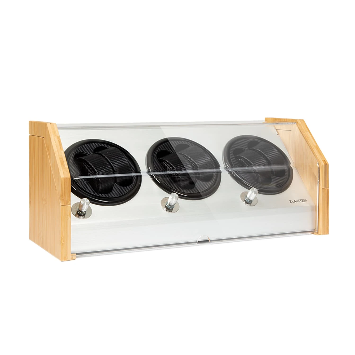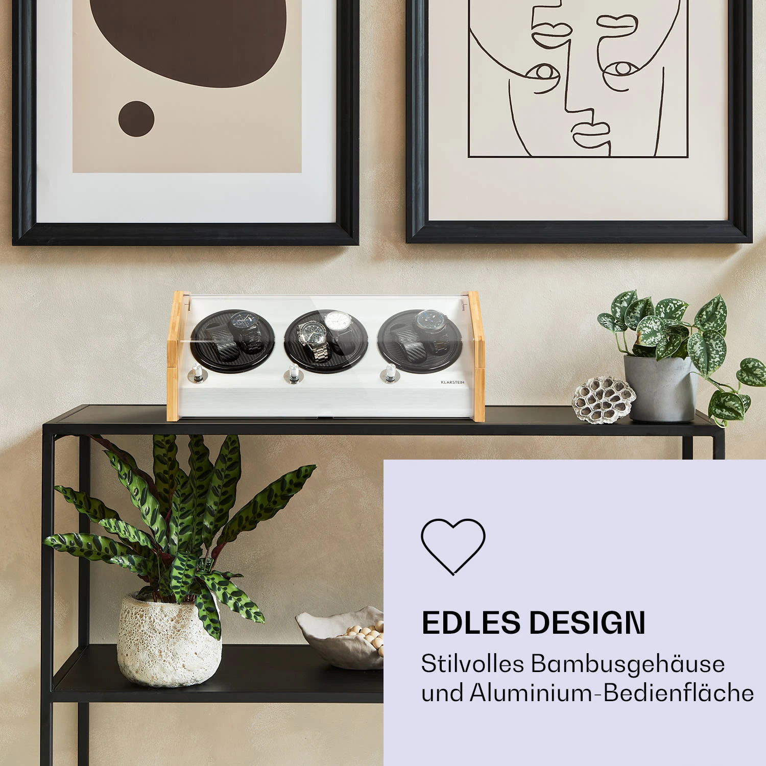 Hier dreht sich alles um formvollendetes Präzisionshandwerk! Der Klarstein Garonne Uhrenbeweger versetzt deine Automatikuhren in Schwingung wenn sie nicht an deinem Arm sind. Dabei überzeugt der Garonne mit einem eleganten Bambusgehäuse, das sich stilvoll in jedes Raum-Ambiente einfügt und deine Uhren stilvoll präsentiert. Drei Drehgeschwindigkeiten und vier Rotationsmodi sorgen für genau die richtige Bewegung für deine Uhren. Dank seines flüsterleisen Motors kannst du den Klarstein Garonne Uhrenbeweger beruhigt auch auf dem Nachtschränkchen aufstellen.