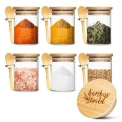 Das perfekte Arrangement zum Würzen und Verschönern: Fülle deine Gewürze in die runden Gläser von Bambuswald und nutze ihre Optik als einzigartige Dekoration. Dank der Deckel aus reinem Bambus mit Silikonring kannst du die Gläser fest und luftdicht verschließen. Das erhält das Aroma der Gewürze langfristig. Die mitgelieferten Bambuslöffel werden einfach in die Hängevorrichtungen an der Seite der insgesamt 6 Gewürzgläser eingesetzt und erleichtern das genaue Portionieren.