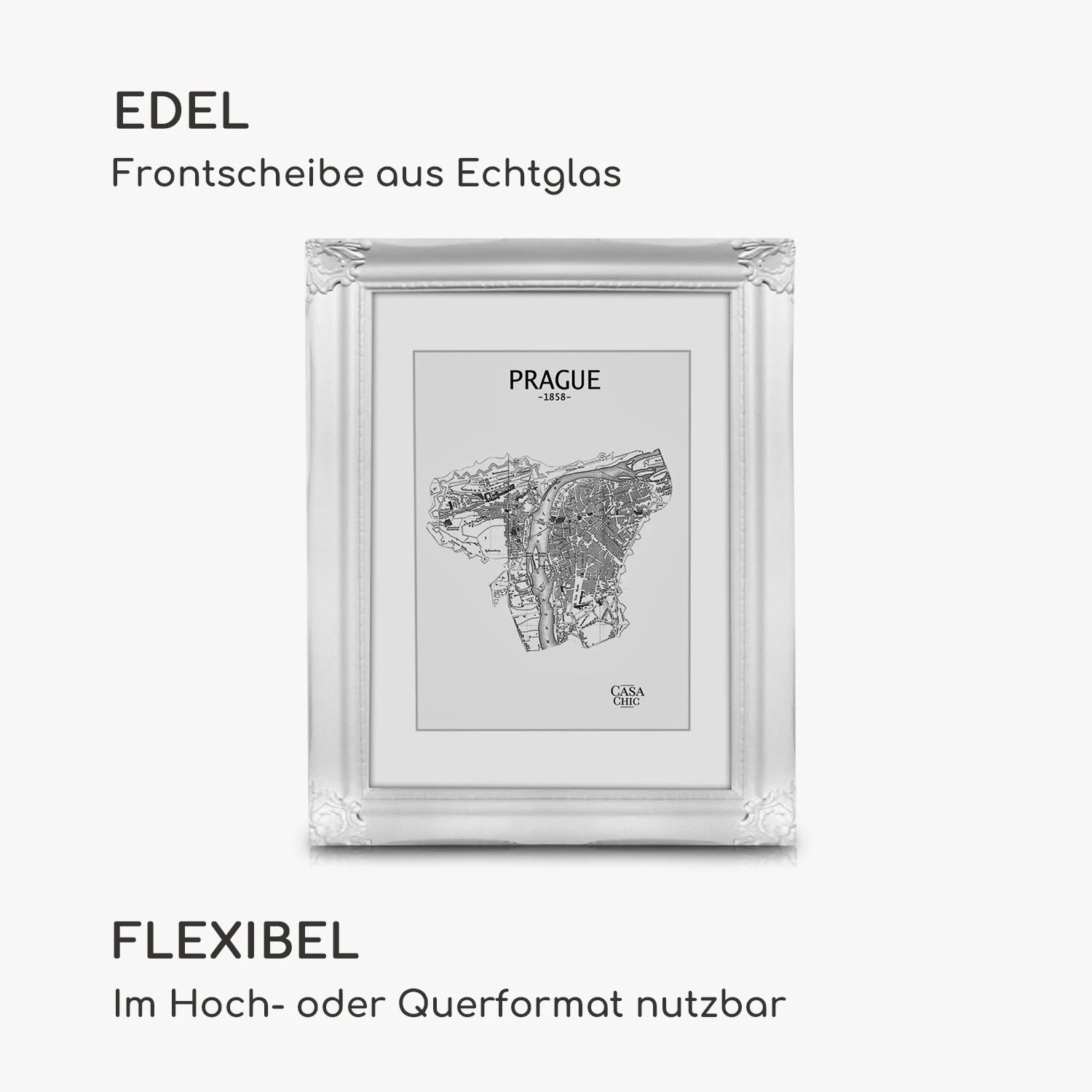 Die Regent Bilderrahmen von Casa Chic by blumfeldt sind aus Echtholz gefertigt und mit Gipsornamenten bestückt. Sie bringen deine Fotos und Bilder sowohl im Hoch- als auch im Querformat ideal zur Geltung. Dabei bildet das aufwendig gestaltet Rahmenprofil im Rokoko-Design einen wunderschönen Kontrast zu modernen Einrichtungen. Gestalte Wandcollagen oder arrangiere deine Lieblingsfotos auf dem Sideboard oder im Regal. Das mitgelieferte Passepartout überlässt dir die Wahl des passenden Bildausschnitts. Die Echtglasscheibe schützt nicht nur vor Staub und Schmutz, sie vervollständigt gekonnt den edlen Look der Regent Rahmen.