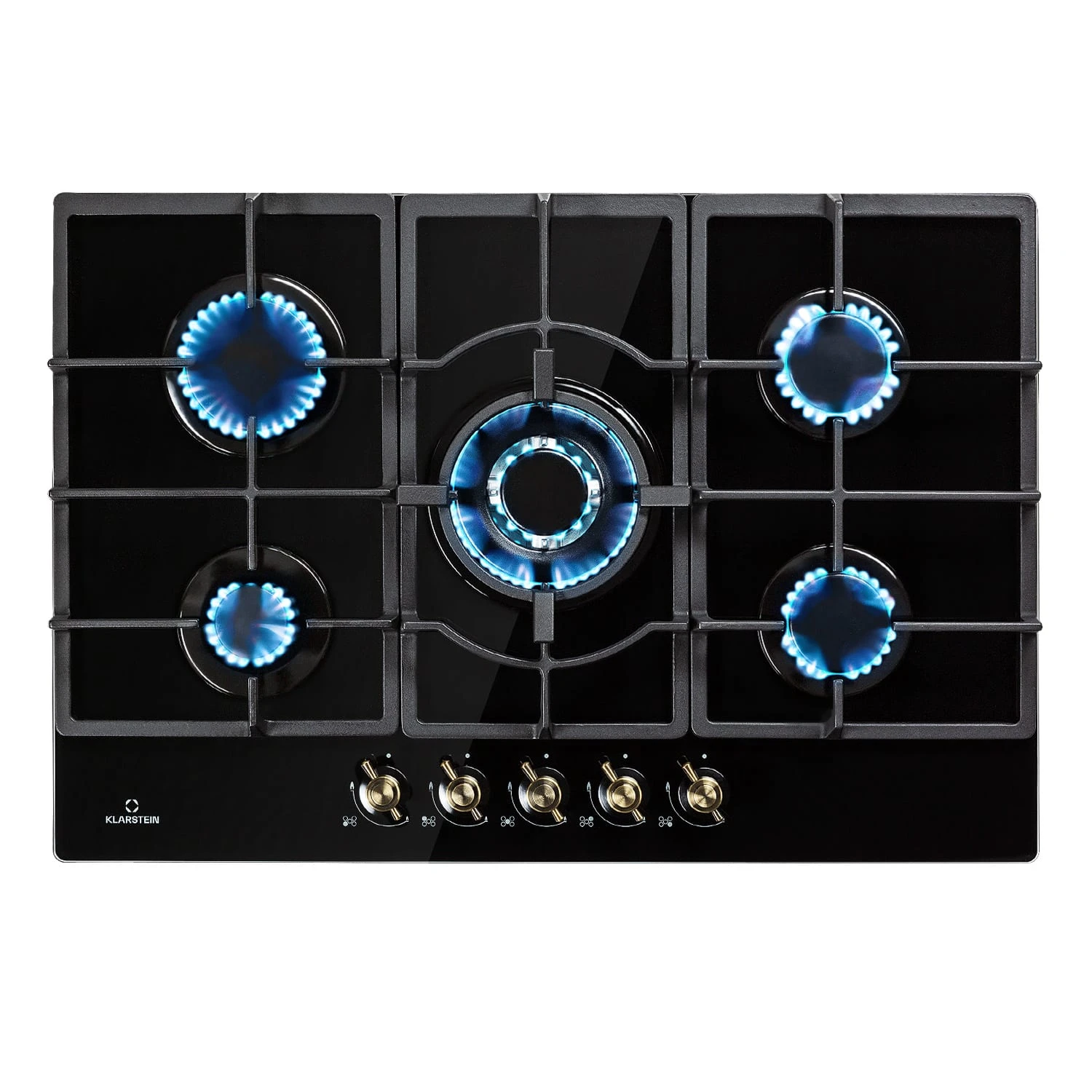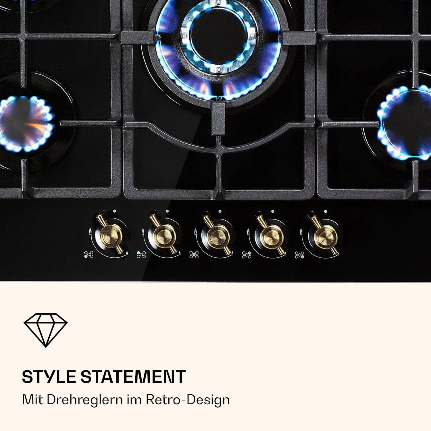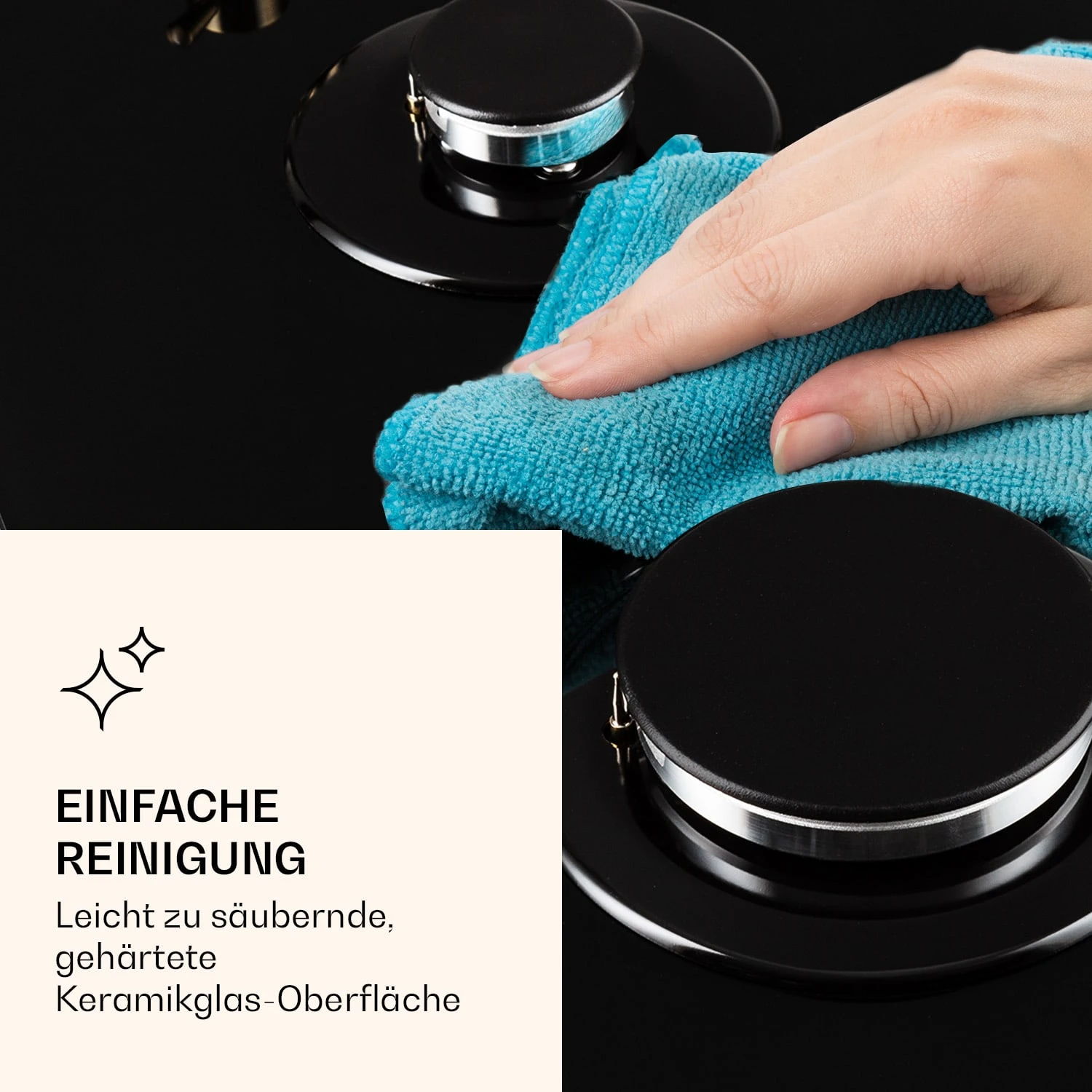 Auf dem geräumigen Klarstein Victoria 5 Gaskochfeld befinden sich fünf hochwertige Sabaf-Brenner, die mit einer Leistung von jeweils 3,6 kW, 3,0 kW und 1 kW sowie zweimal 1,75 kW ordentlich einheizen. Durch seine unterschiedlichen Brenner-Größen ist das Victoria 5 für jede erdenkliche Mahlzeit geeignet – dabei verteilen die Brenner die Hitze gleichmäßig in der Mitte und an den Rändern deines Kochgeschirrs, so wird alles perfekt gegart. Die Bedienung ist dank der selbsterklärenden Symbole an den großen im Retro-Design gestalteten Drehknöpfen absolut intuitiv, die Hitzezufuhr kann während des Kochvorgangs immer wieder direkt angepasst werden. Via SnapJetIgnition entzündest du die Flamme, somit ist kein zusätzliches Feuer nötig. Die drei abnehmbaren Kreuze aus massivem Gusseisen sitzen passgenau und kippsicher über den Flammen. Das Kochfeld ist mit einer gehärteten, pflegeleichten Keramikglas-Beschichtung versehen, die nicht nur gut aussieht, sondern auch besonders leicht zu reinigen ist.